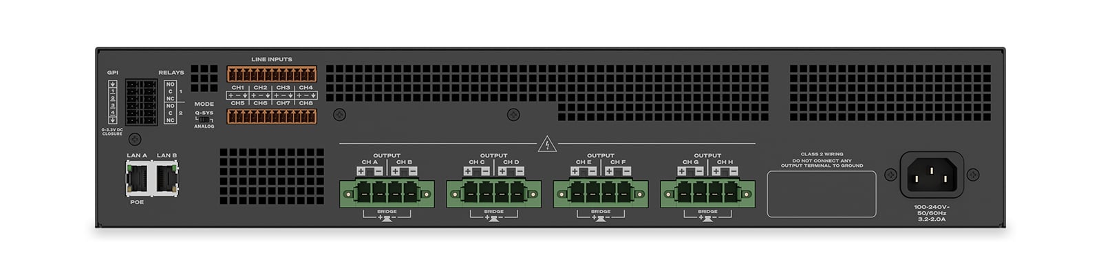 - 所有通道均支持低阻抗、高阻抗、70 V和100 V直驱(无需桥接,也无需手动开关)